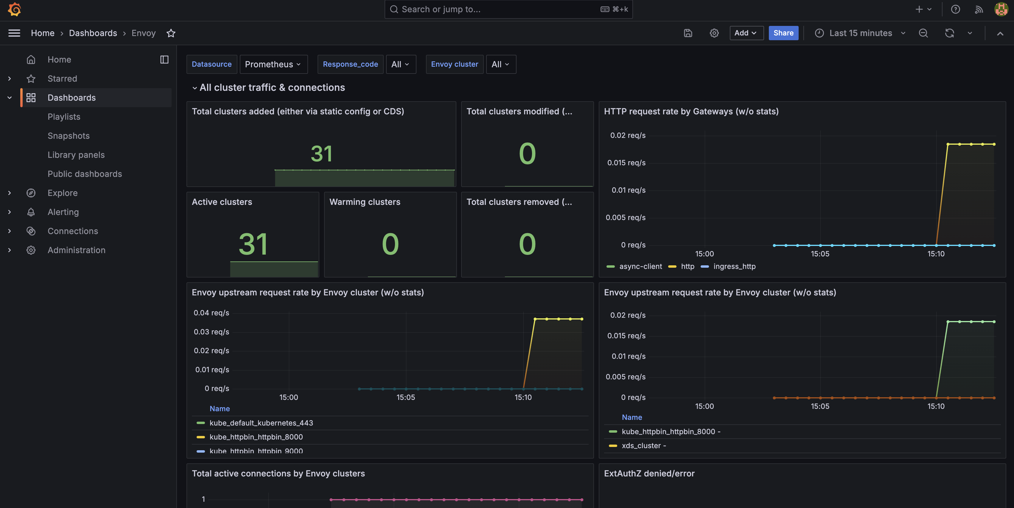 4. Go to Dashboards > Envoy to open the Envoy dashboard that you imported. Verify that you see Envoy-specific data, such as the number of clusters, request rates, or active connections. You can also see metrics for the traffic that you generated for the httpbin app.